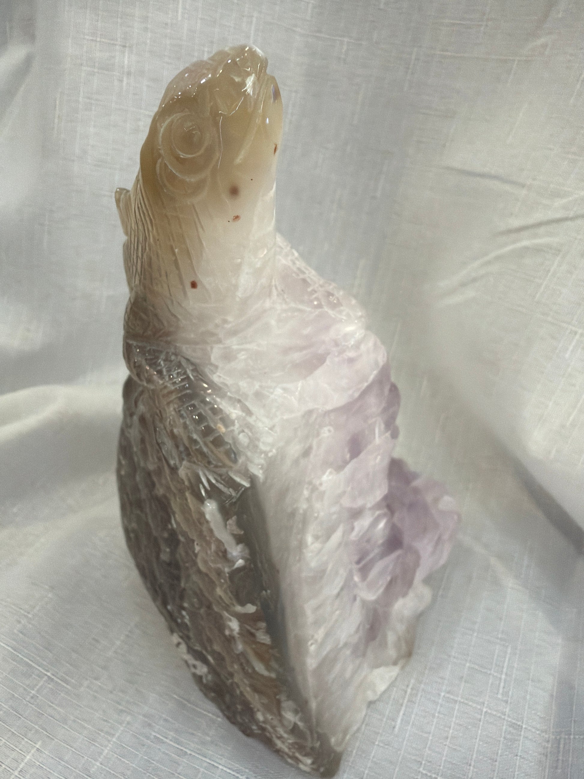This one-of-a-kind geode features intricate carvings showcasing the unique patterns and colours of amethyst and its agate matrix.